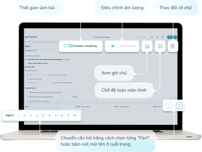 Giao diện bài thi thử trên IELTS AI Test mô phỏng giống hệt bài thi IELTS thật, giúp người học làm quen với cấu trúc và cách thức thi. Từng phần thi đều được trình bày rõ ràng, dễ thao tác và kiểm tra tiến độ.